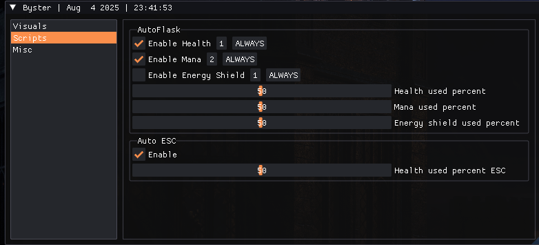 • Script Slider - allows adjusting values for scripts using a slider (Health, Mana, Energy Shield, and Auto ESC)