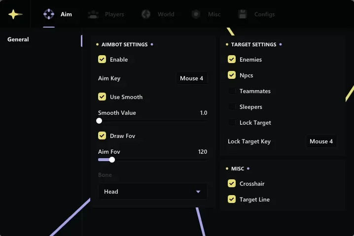 • Targets (Enemies, NPCs, Teammates, Sleepers, Friends) - selecting targets for aim