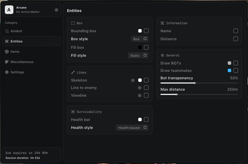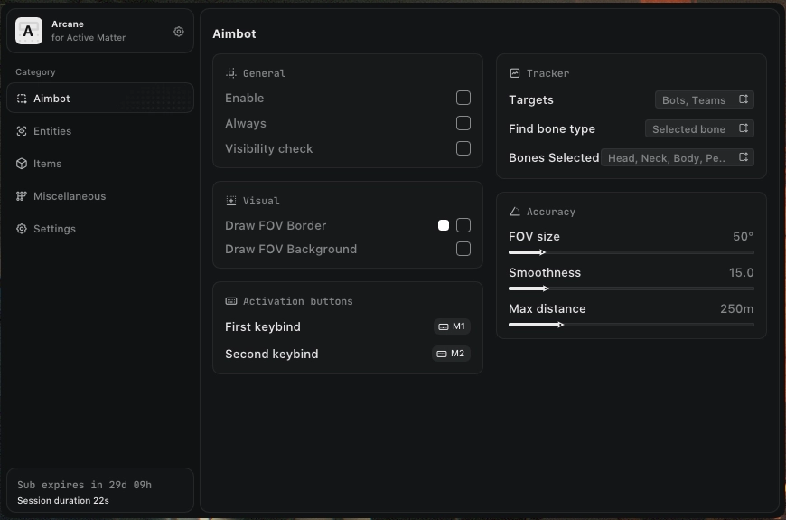 Private cheat Arcane Active Matter Cheat is developed with modern anti-cheat systems in mind and is regularly updated to maintain "Undetected" status. All purchase data is stored encrypted and is available only to you and our support service.