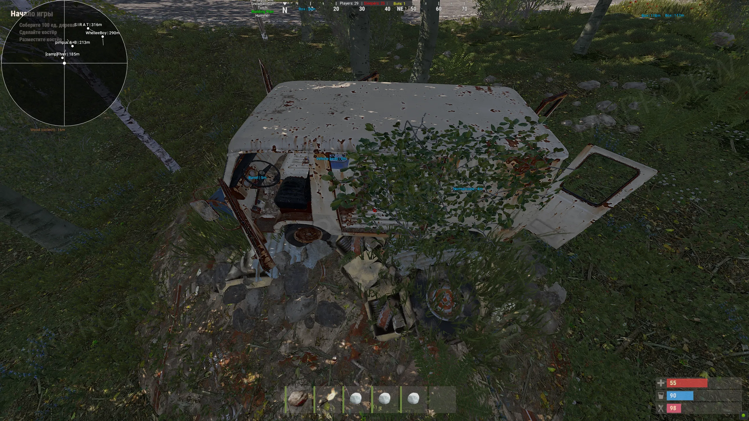 • Collectibles (Wood, Stone, Metal, Sulfur, Hemp, Diesel) - just pick up from the ground